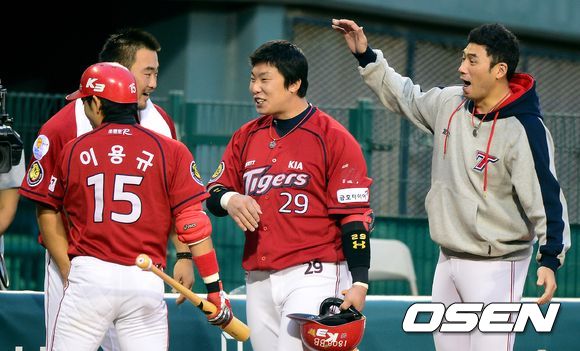 5일 오후 서울 잠실야구장에서 열린 '2013 한국야쿠르트 세븐 프로야구' 두산 베어스와 KIA 타이거즈의 경기, 1회초 무사에서 KIA 이용규가 선두타자 홈런을 날리고 더그아웃에서 동료선수들과 기뻐하고 있다.