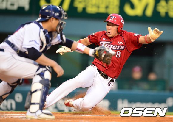 5일 오후 서울 잠실야구장에서 열린 '2013 한국야쿠르트 세븐 프로야구' 두산 베어스와 KIA 타이거즈의 경기, 1회초 무사 1,2에서 KIA 나지완의 1타점 좌전 적시타에 2루주자 안치홍이 홈에서 슬라이딩하며 세이프되고 있다.