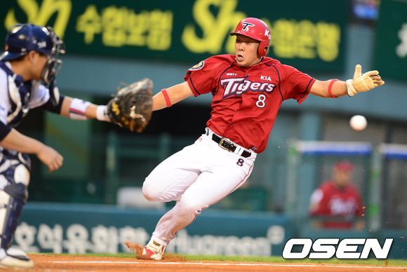 5일 오후 서울 잠실야구장에서 열린 '2013 한국야쿠르트 세븐 프로야구' 두산 베어스와 KIA 타이거즈의 경기, 1회초 무사 1,2에서 KIA 나지완의 1타점 좌전 적시타에 2루 주자 안치홍에 홈에서 슬라이딩하며 세이프되고 있다.
