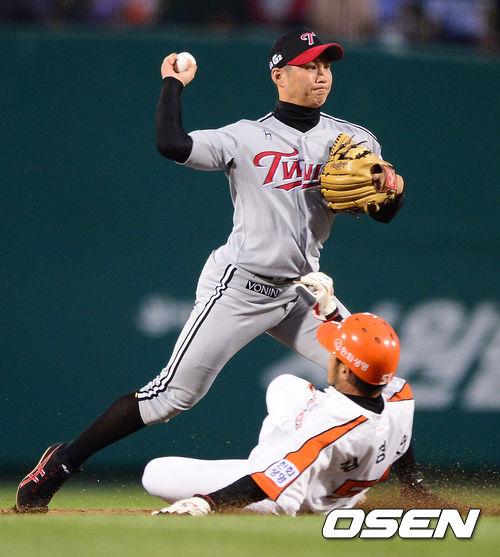 5일 오후 대전구장에서 열린 '2013 한국야쿠르트 세븐 프로야구' 한화 이글스와 LG트윈스의 경기,2회말 무사 1,2루 한화 정현석의 내야땅볼때 LG 오지환 유격수가 1루 주자 김경언을 포스아웃 시킨후 병살 시도하고 있다.