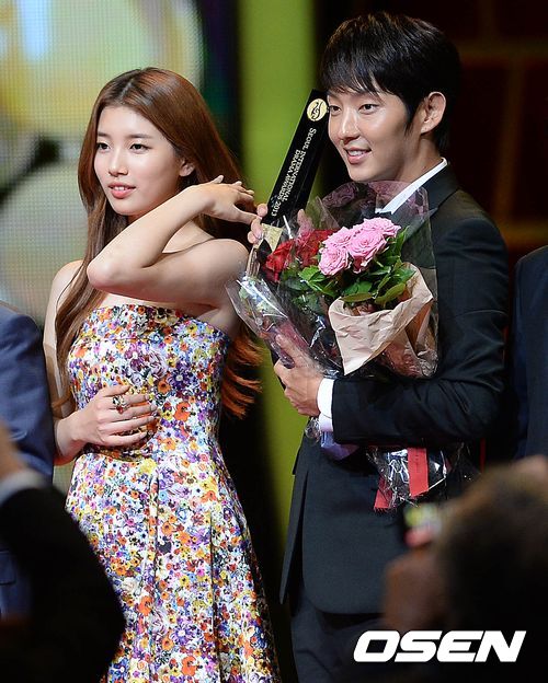 한류드라마 남자배우상을 수상한 이준기, 여자배우상을 수상한 수지가 기념촬영을 하고 있다.