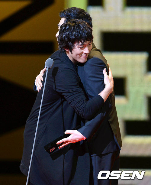 배우 장혁이 시리즈/시리얼 우수상을 대리수상한 '추적자'의 배우 손현주를 축하하고 있다.