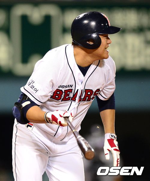 5일 오후 서울 잠실야구장에서 열린 '2013 한국야쿠르트 세븐 프로야구' 두산 베어스와 KIA 타이거즈의 경기, 3회말 1사 2,3루에서 두산 오재일이 내야땅볼을 날리고 타구를 바라보고 있다. KIA 이범호 볼을 놓치며 동점에 성공.