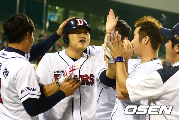 5일 오후 서울 잠실야구장에서 열린 '2013 한국야쿠르트 세븐 프로야구' 두산 베어스와 KIA 타이거즈의 경기, 5회말 1사 1루에서 두산 오재일이 투런포를 날리고 더그아웃에서 동료선수들과 기뻐하고 있다.