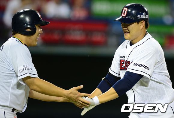 5일 오후 서울 잠실야구장에서 열린 '2013 한국야쿠르트 세븐 프로야구' 두산 베어스와 KIA 타이거즈의 경기, 5회말 1사 1루에서 두산 오재일이 우월 투런포를 날리고 홈을 밟으며 김현수와 기뻐하고 있다.