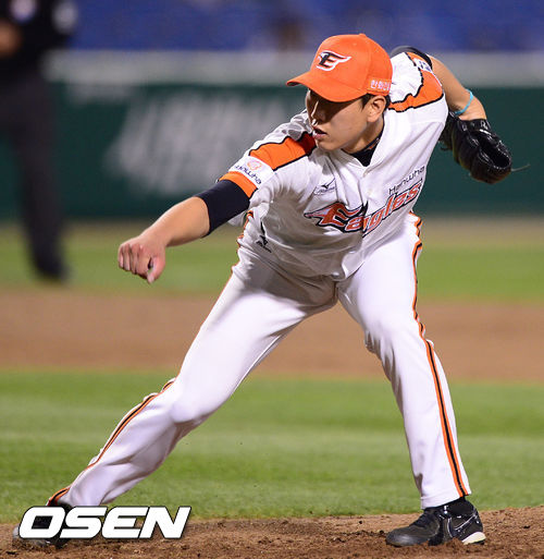 5일 오후 대전구장에서 열린 '2013 한국야쿠르트 세븐 프로야구' 한화 이글스와 LG트윈스의 경기,8회초 2사 3루 한화 김혁민 투수가 LG 정의윤을 삼진아웃 시키며 위기를 넘기고 있다.