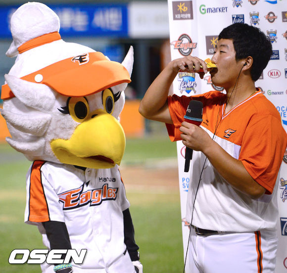 경기종료 후 무실점 호투를 펼친 한화 송창현 선발투수가 인터뷰중 한약을 마시고 있다./ soul1014@osen.co.kr