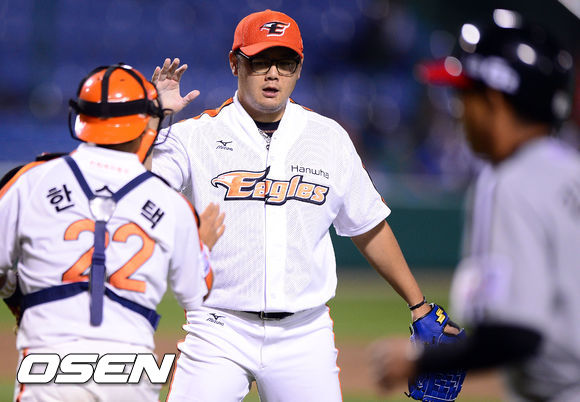 경기종료 후 한화 송창식과 한승택 포수가 하이파이브를 하고 있다. / soul1014@osen.co.kr