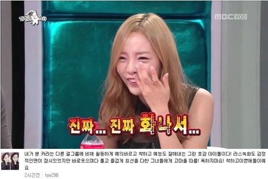 김태희 작가는 6일 오전 자신의 트위터에 “내가 본 카라는 다른 걸그룹에 비해 월등하게 예의 바르고 착하고 예능도 잘해내는 그런 호감 아이돌이다”고 이번 논란에 대해 입을 열었다.
