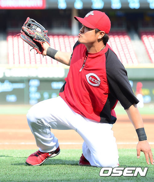 6일 (이하 한국시간) 미국 오하이오주 신시내티 그레이트 아메리칸 볼파크에서 2013 메이저리그 신시내티 레즈와 세인트루이스 카디널스의 경기가 열릴 예정인 가운데 훈련시간에 신시내티 추신수가 수비훈련을 하고 있다.