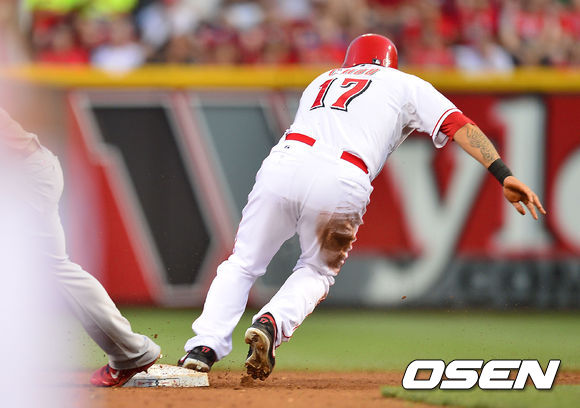 6일 (이하 한국시간) 미국 오하이오주 신시내티 그레이트 아메리칸 볼파크에서 열린 2013 메이저리그 신시내티 레즈와 세인트루이스 카디널스의 경기, 2회 2사 1,3루 신시내티 필립스의 선취 1타점 내야 안타때 2루에서 추신수가 세이프 되고 있다.