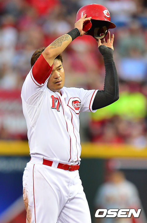 6일 (이하 한국시간) 미국 오하이오주 신시내티 그레이트 아메리칸 볼파크에서 열린 2013 메이저리그 신시내티 레즈와 세인트루이스 카디널스의 경기, 2회 2사 1,3루 신시내티 필립스의 선취 1타점 내야 안타때 2루에서 추신수가 세이프 된 후 땀을 닦고 있다.