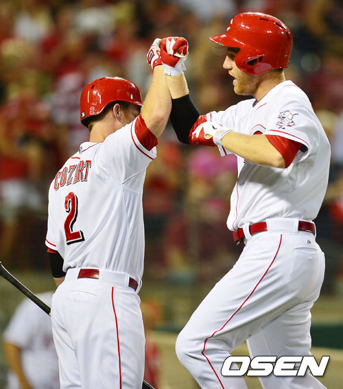 6일 (이하 한국시간) 미국 오하이오주 신시내티 그레이트 아메리칸 볼파크에서 열린 2013 메이저리그 신시내티 레즈와 세인트루이스 카디널스의 경기, 3회말 신시내티 프레이저가 좌월 솔로홈런을 날린 후 홈에서 잭 코자트와 기쁨을 나누고 있다.