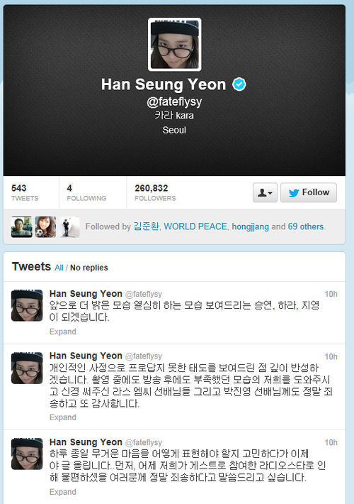 한승연은 지난 5일 자신의 트위터에 "하루 종일 무거운 마음을 어떻게 표현해야 할지 고민하다가 이제야 글 올립니다"면서 "먼저 어제 저희가 게스트로 참여한 '라디오스타'로 인해 불편하셨을 여러분께 정말 죄송하다고 말씀드리고 싶습니다"라고 사과글을 게재했다.