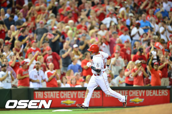 6일 (이하 한국시간) 미국 오하이오주 신시내티 그레이트 아메리칸 볼파크에서 열린 2013 메이저리그 신시내티 레즈와 세인트루이스 카디널스의 경기, 4회말 1사 주자 없는 상황에서 신시내티 추신수가 좌중월 솔로 홈런을 날린 후 그라운드를 돌고 있다. 시즌 20호