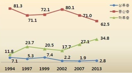 하류층 증가 인식은 ‘중산층’ 여부 질문에서도 여실히 드러난다. 중산층이라고 답한 응답자는 2002년 80.1%에서 2007년 71.0%, 올해 62.5%이다. 물론 역대 최저치이다. 상류층에 속한다고 평가한 사람은 2.7%로 6년 전(1.9%)보다 늘었다.