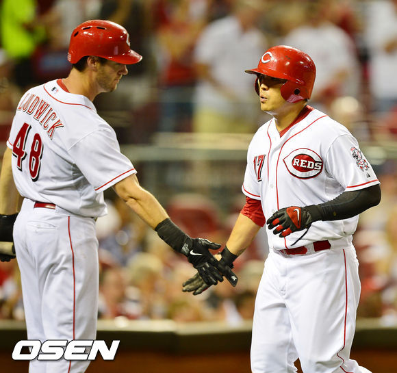 6일 (이하 한국시간) 미국 오하이오주 신시내티 그레이트 아메리칸 볼파크에서 열린 2013 메이저리그 신시내티 레즈와 세인트루이스 카디널스의 경기, 6회말 2사 주자1,2루 신시내티 브루스가 중전 1타점 적시타때 2루 주자 추신수가 홈을 밟고 있다.