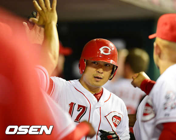 6일 (이하 한국시간) 미국 오하이오주 신시내티 그레이트 아메리칸 볼파크에서 열린 2013 메이저리그 신시내티 레즈와 세인트루이스 카디널스의 경기, 6회말 2사 주자1,2루 신시내티 브루스가 중전 1타점 적시타때 홈을 밟은 추신수가 덕아웃에서 동료들과 하이파이브를 하고 있다.