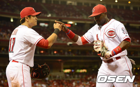 6일 (이하 한국시간) 미국 오하이오주 신시내티 그레이트 아메리칸 볼파크에서 열린 2013 메이저리그 신시내티 레즈와 세인트루이스 카디널스의 경기, 6회초 세인트루이스 벨트란의 3루수 병살타때 신시내티 필립스가 병살 연결에 성공한 후 덕아웃으로 들어가며 추신수와 하이파이브를 하고 있다.