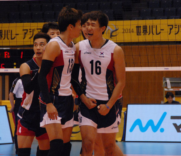 한국이 뉴질랜드를 가볍게 잡고 2014년 세계남자배구선수권대회 아시아지역 최종라운드 첫 승리를 거뒀다.