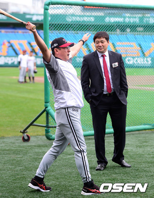 6일 오후 대전구장에서 열린 '2013 한국야쿠르트 세븐 프로야구' 한화 이글스와 LG트윈스의 경기에 앞서 LG 김기태 감독이 양준혁 해설위원의 타격 자세를 흉내내고 있다