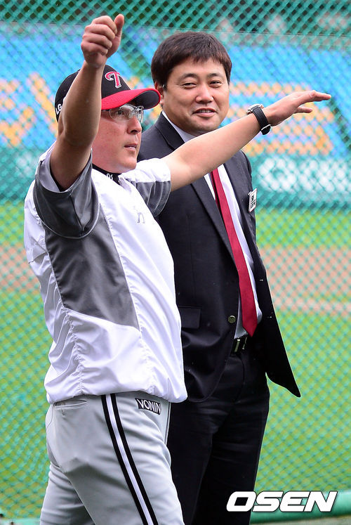 6일 오후 대전구장에서 열린 '2013 한국야쿠르트 세븐 프로야구' 한화 이글스와 LG트윈스의 경기에 앞서 LG 김기태 감독이 양준혁 해설위원의 타격 자세를 흉내내고 있다