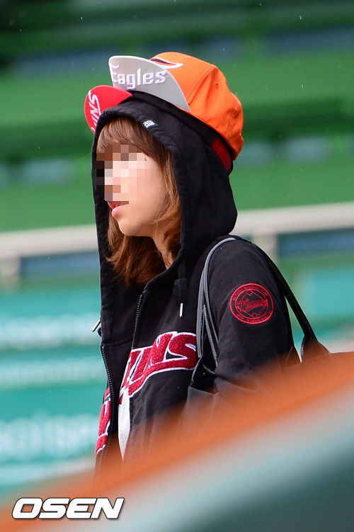 6일 오후 대전구장에서 열린 '2013 한국야쿠르트 세븐 프로야구' 한화 이글스와 LG트윈스의 경기에 앞서 LG와 한화 모자를 겹쳐쓴 야구팬이 선수들의 훈련을 지켜보고 있다