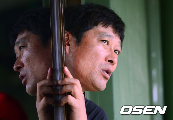 6일 오후 대전구장에서 열린 '2013 한국야쿠르트 세븐 프로야구' 한화 이글스와 LG트윈스의 경기에 앞서 한화 이종범 코치가 부슬비를 바라보면 걱정스러운 표정을 짓고 있다