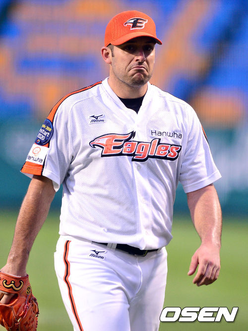 6일 오후 대전구장에서 열린 '2013 한국야쿠르트 세븐 프로야구' 한화 이글스와 LG트윈스의 경기, 1회초 선취점을 허용한 한화 선발투수 이브랜드가 이닝종료 후 아쉬운 표정으로 더그아웃으로 들어가고 있다