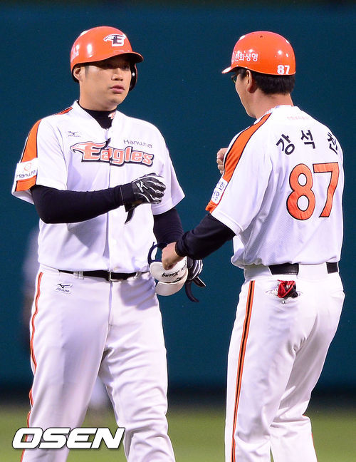 6일 오후 대전구장에서 열린 '2013 한국야쿠르트 세븐 프로야구' 한화 이글스와 LG트윈스의 경기, 1회말 2사 2루 한화 최진행이 동점 적시타를 날린후 강석천 코치와 하이파이브를 하고 있다
