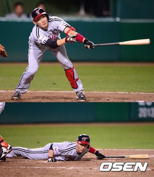 6일 오후 대전구장에서 열린 '2013 한국야쿠르트 세븐 프로야구' 한화 이글스와 LG트윈스의 경기, 5회초 1사 1루 LG 손주인이 헛스윙후 그라운드에 엎드려 있다