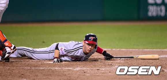 6일 오후 대전구장에서 열린 '2013 한국야쿠르트 세븐 프로야구' 한화 이글스와 LG트윈스의 경기,5회초 1사 1루 LG 손주인이 헛스윙 후 엎드려 있다