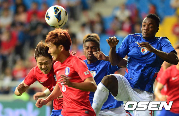 6일 오후 인천 축구전용경기장에서 열린 한국과 아이티의 친선 경기 전반 김영권과 손흥민이 문전에서 공중볼다툼을 하고 있다.