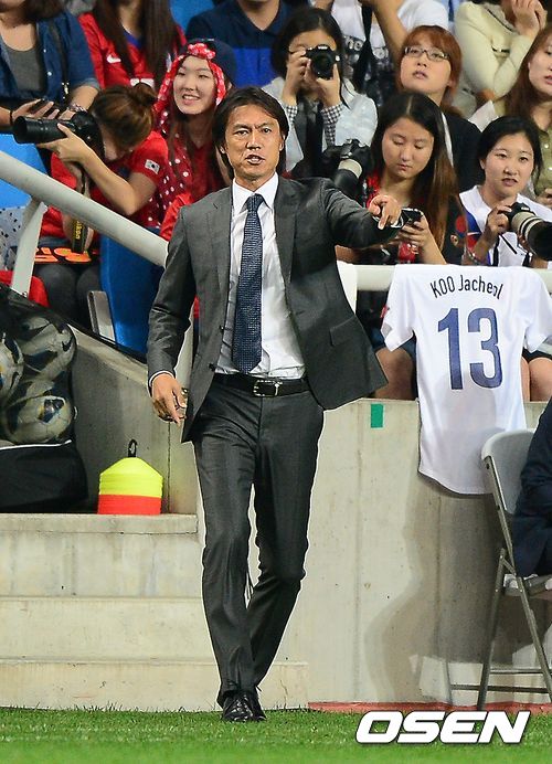 6일 오후 인천 축구전용경기장에서 열린 한국과 아이티의 친선 경기, 전반 홍명보 감독이 선수들을 독려하고 있다.