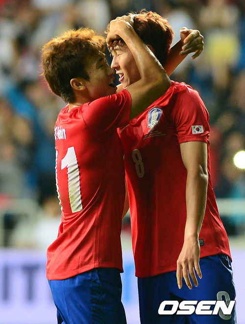6일 오후 인천 축구전용경기장에서 열린 한국과 아이티의 친선 경기 전반 손흥민이 첫골을 넣은 후 고요한과 포옹을 하고 있다.