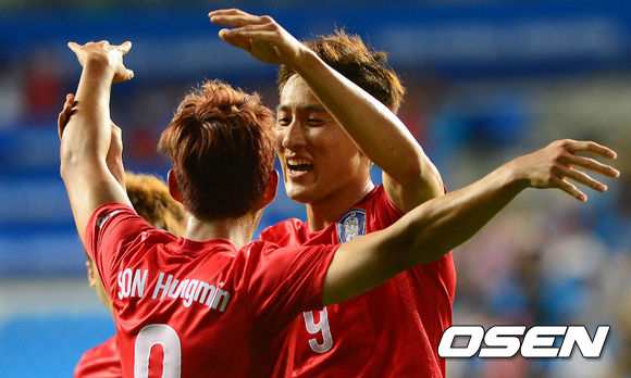 6일 오후 인천 축구전용경기장에서 열린 한국과 아이티의 친선 경기 전반 손흥민이 골을 넣은 후 지동원과 포옹을 하고 있다.