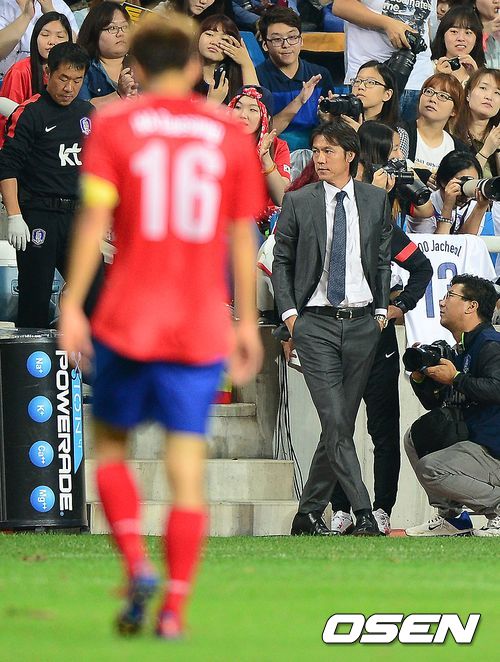 6일 오후 인천 축구전용경기장에서 열린 한국과 아이티의 친선 경기, 전반종료 직전 아이티 벨포트에 동점을 허용한 한국 홍명보 감독이 하프타임에 생각에 잠겨 있다. 한국은 손흥민이 선제골을 넣었다.