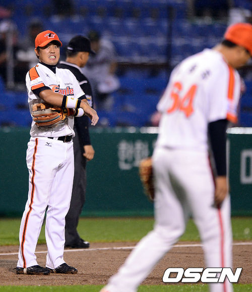 6일 오후 대전구장에서 열린 '2013 한국야쿠르트 세븐 프로야구' 한화 이글스와 LG트윈스의 경기, 8회초 1사 3루 한화 한승택 포수의 송구 실책으로 공을 놓친 오선진 3루수가 안타까워하고 있다. 3루 주자 문선재는 득점.
