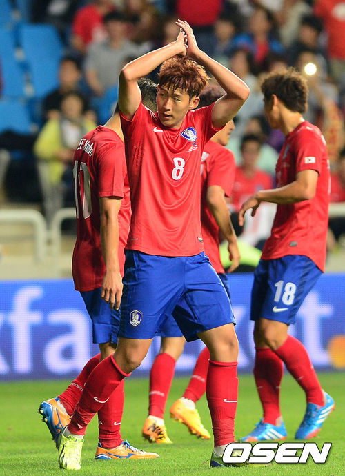 6일 오후 인천 축구전용경기장에서 열린 한국과 아이티의 친선 경기 후반 손흥민이 한국 네번째 골을 넣은 후 기뻐하고 있다.