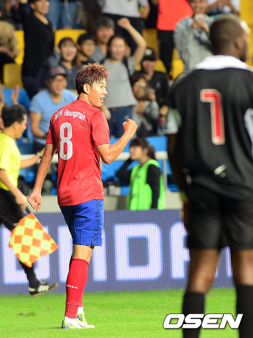 6일 오후 인천 축구전용경기장에서 열린 한국과 아이티의 친선 경기 후반 손흥민이 한국의 네번째 골을 넣은 후 기뻐하고 있다.