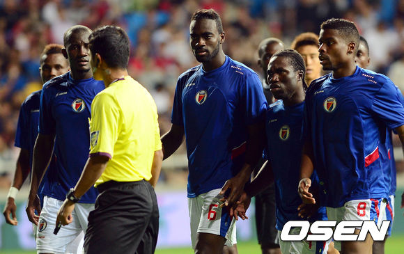6일 오후 인천 축구전용경기장에서 열린 한국과 아이티의 친선 경기 후반 이청용이 문전에서 넘어지면서 페널티킥이 선언 되자 아이티 선수들이 심판에게 항의를 하고 있다.