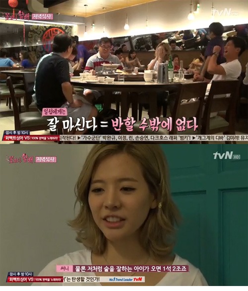써니는 6일 방송된 tvN '꽃보다 할배'에서 저녁식사 도중 할배들이 권한 술을 잘 들이켰다. 가녀린 외모와 달리 술을 잘마시는 모습이 반전이었다.