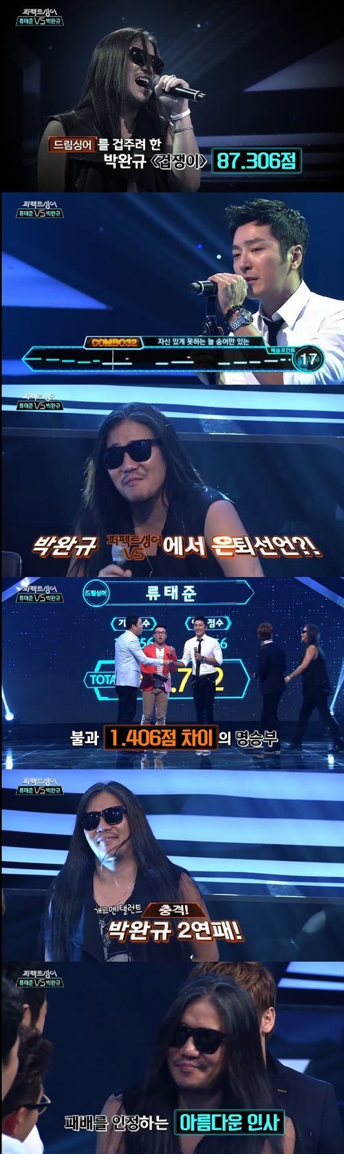 박완규는 6일 오후 방송된 케이블채널 tvN 예능프로그램 '퍼펙트 싱어 VS'에 가수팀의 첫 주자로 등장, 드림싱어 첫 도전자인 류태준과 노래 대결을 펼쳤다.