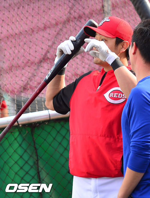 7일 (이하 한국시간) 미국 오하이오주 신시내티 그레이트 아메리칸 볼파크에서 2013 메이저리그 신시내티 레즈와 LA 다저스의 경기가 열릴 예정인 가운데 양팀 훈련시간에 신시내티 추신수가 다저스 류현진에게 사인을 보내고 있다.