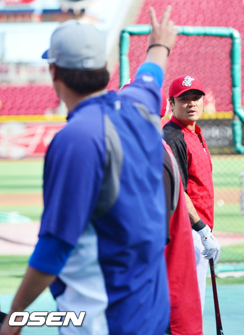 7일 (이하 한국시간) 미국 오하이오주 신시내티 그레이트 아메리칸 볼파크에서 2013 메이저리그 신시내티 레즈와 LA 다저스의 경기가 열릴 예정인 가운데 양팀 훈련시간에 신시내티 추신수와 다저스 류현진이 얘기를 나눈 후 류현진이 추신수에게 인사를 하고 헤어지고 있다.