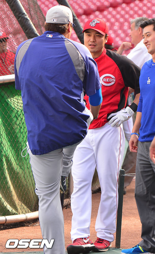 7일 (이하 한국시간) 미국 오하이오주 신시내티 그레이트 아메리칸 볼파크에서 2013 메이저리그 신시내티 레즈와 LA 다저스의 경기가 열릴 예정인 가운데 양팀 훈련시간에 신시내티 추신수와 다저스 류현진이 얘기를 나누고 있다.