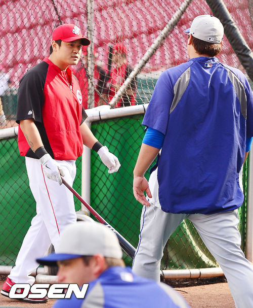 7일 (이하 한국시간) 미국 오하이오주 신시내티 그레이트 아메리칸 볼파크에서 2013 메이저리그 신시내티 레즈와 LA 다저스의 경기가 열릴 예정인 가운데 양팀 훈련시간에 신시내티 추신수가 타격연습을 마친 후 류현진과 얘기를 나누고 있다.