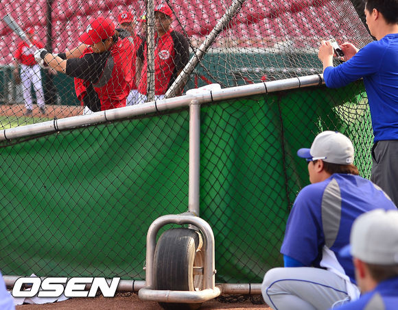 7일 (이하 한국시간) 미국 오하이오주 신시내티 그레이트 아메리칸 볼파크에서 2013 메이저리그 신시내티 레즈와 LA 다저스의 경기가 열릴 예정인 가운데 양팀 훈련시간에 다저스 류현진이 신시내티 추신수의 타격 연습을 앉아서 지켜보고 있다.