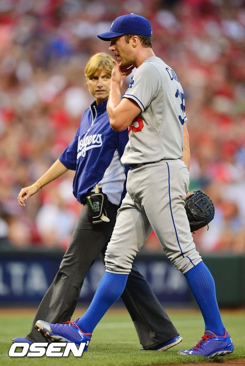 7일 (이하 한국시간) 미국 오하이오주 신시내티 그레이트 아메리칸 볼파크에서 열린 2013 메이저리그 신시내티 레즈와 LA 다저스의 경기에서 2회말 2사 다저스 선발 카푸아노가 고통을 호소하며 교체되고 있다.