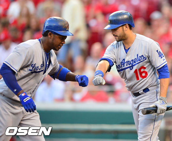 7일 (이하 한국시간) 미국 오하이오주 신시내티 그레이트 아메리칸 볼파크에서 열린 2013 메이저리그 신시내티 레즈와 LA 다저스의 경기에서 1회초 2사 주자 2루 다저스 라미레스가 선취 좌월 투런홈런을 날린 후 홈을 밟으며 이디어와 하이파이브를 하고 있다.
